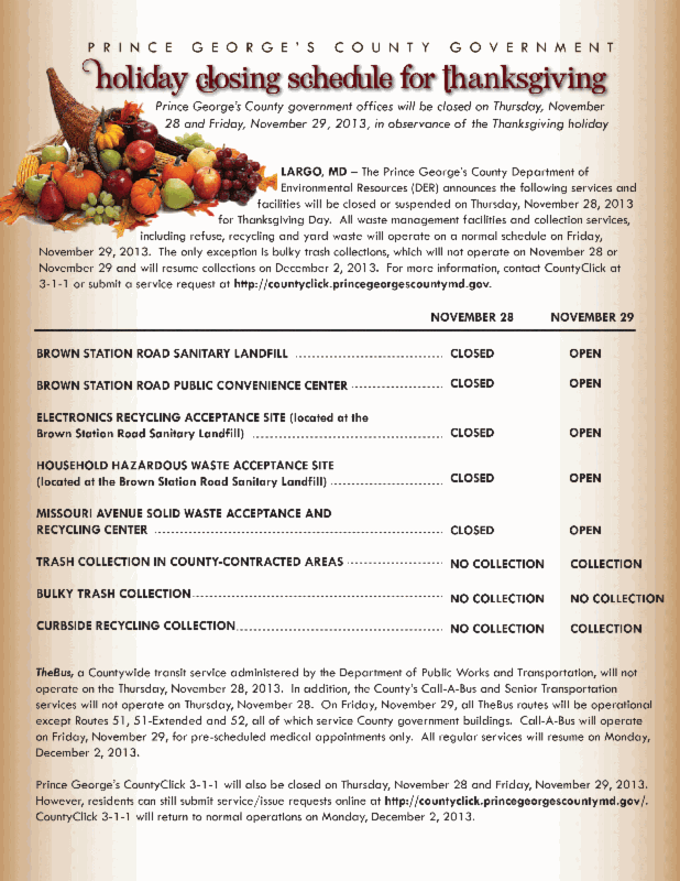 Prince George’s County Thanksgiving Holiday Closures