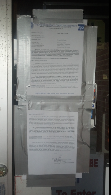 The Prince George’s County Police Department issued a violation notice to the owners of Hangar Club ordering their business closed on June 27, 2014.