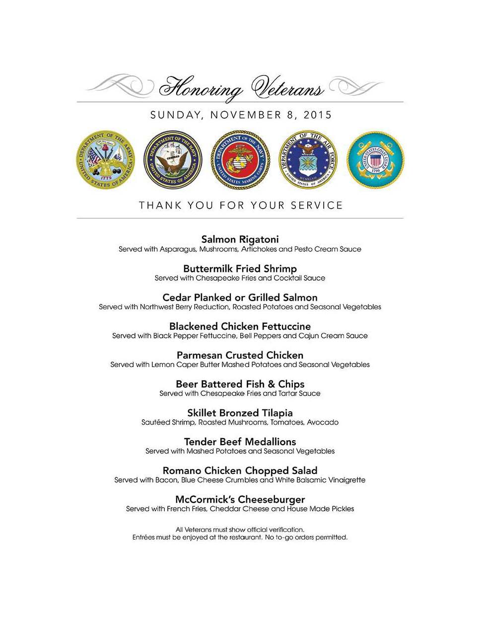 McCormick & Schmick’s invites Veterans to enjoy a complimentary meal on the Sunday before Veterans Day,November 8th, 10:30am – 11pm