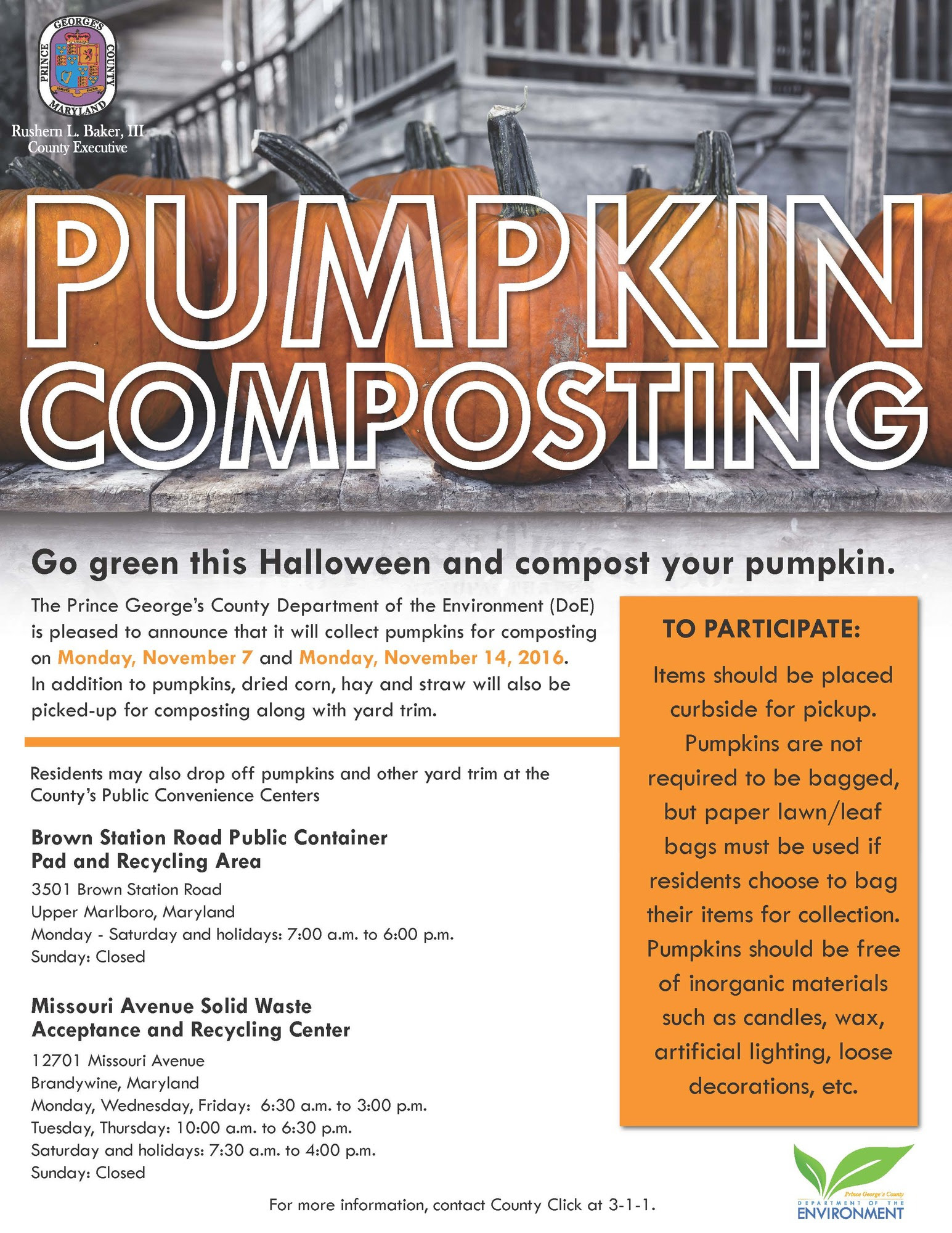 Residents may also drop off pumpkins and other yard trim for composting at the County’s Public Convenience Centers located in Upper Marlboro and Brandywine.
