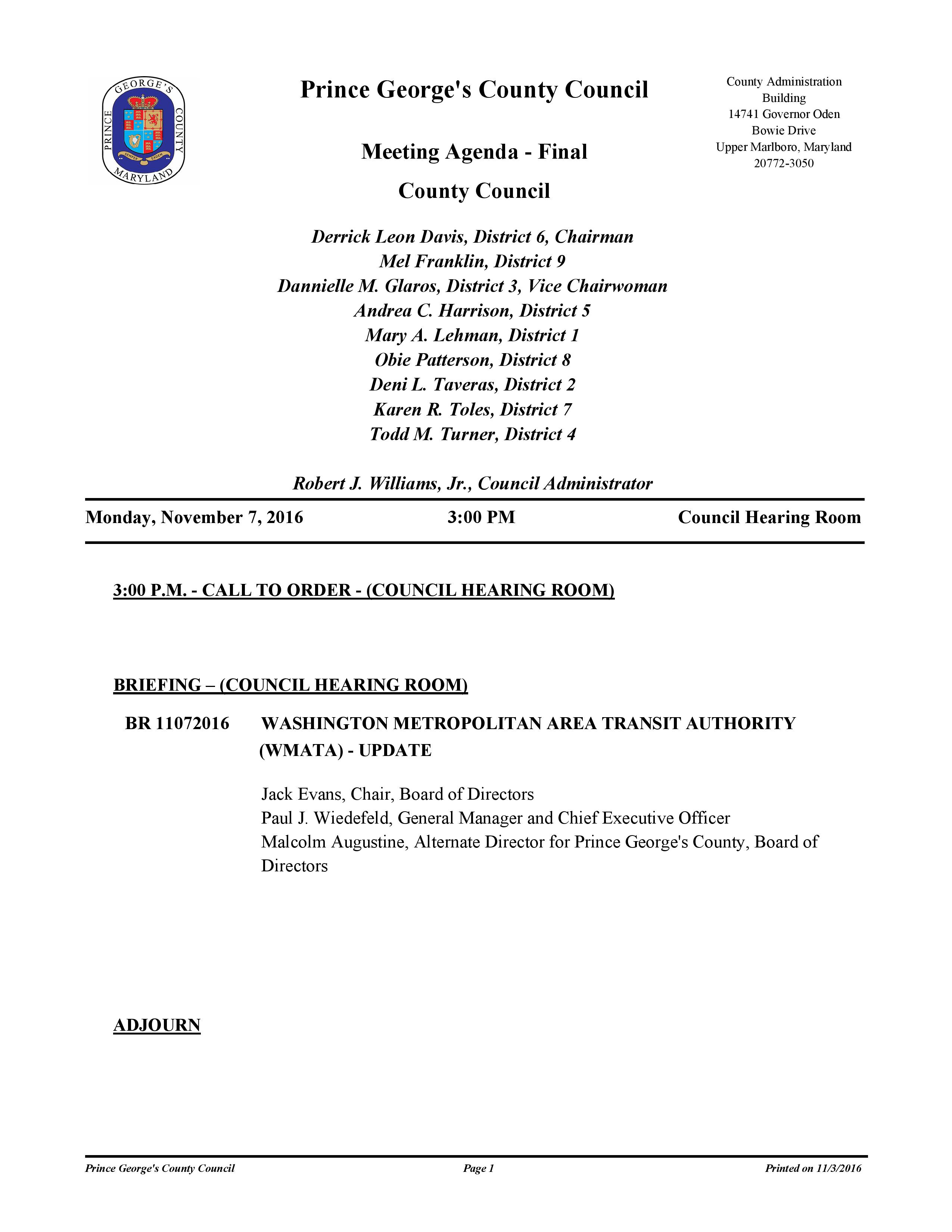 The County Council will hold a Washington Metropolitan Area Transit Authority (WMATA) briefing on Monday, November 7th, at 3pm in the Council Hearing Room. Mr. Jack Evans, Chair, Mr. Paul Wiedefeld, General Manager, and Mr. Malcolm Augustine, Prince George’s County Representative on the Board of Directors will be in attendance to give the briefing. Please see information below.