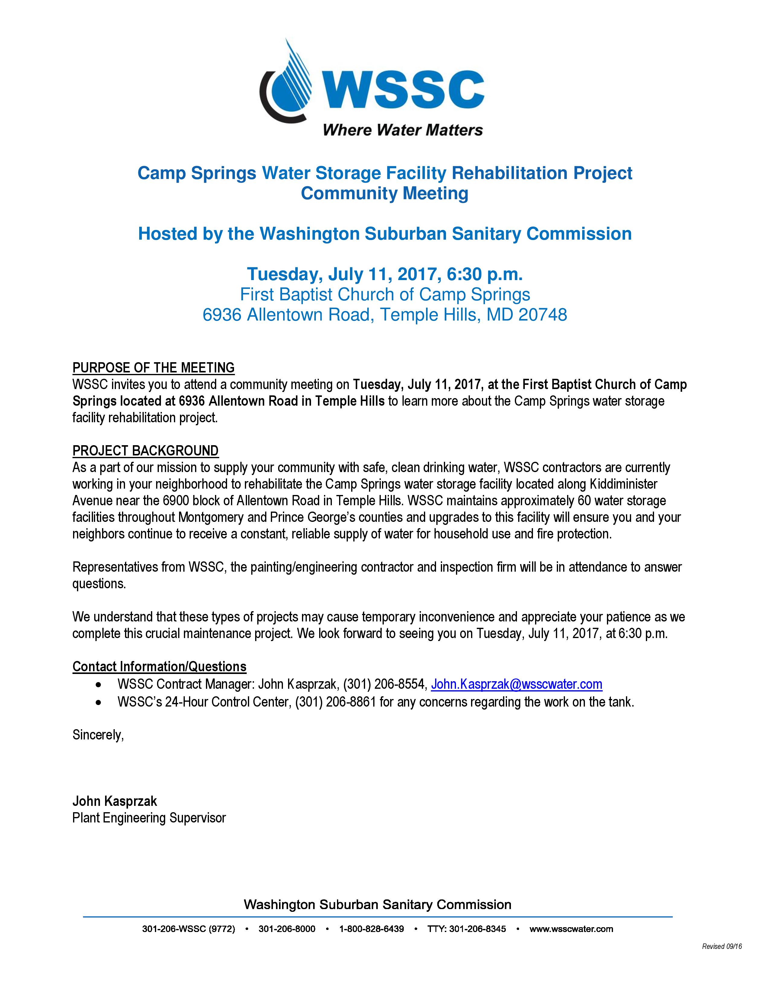 Camp Springs Water Tank Meeting Follow-Up 7-11-17
