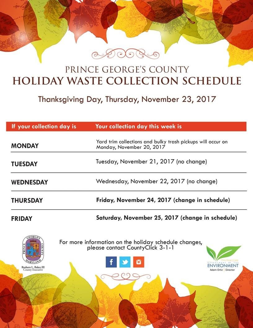 Largo, MD – Residents receiving County-contracted trash and recycling collection service will see a change due to the Thanksgiving holiday.