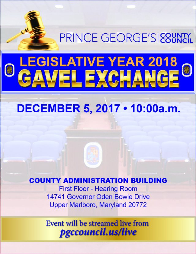 Council will meet Tuesday, December 5, at 10:00 a.m., for the Legislative Year 2018 Gavel Exchange in the Council Hearing Room, First Floor, County Administration Building, 14741 Governor Oden Bowie Drive in Upper Marlboro, Maryland.
