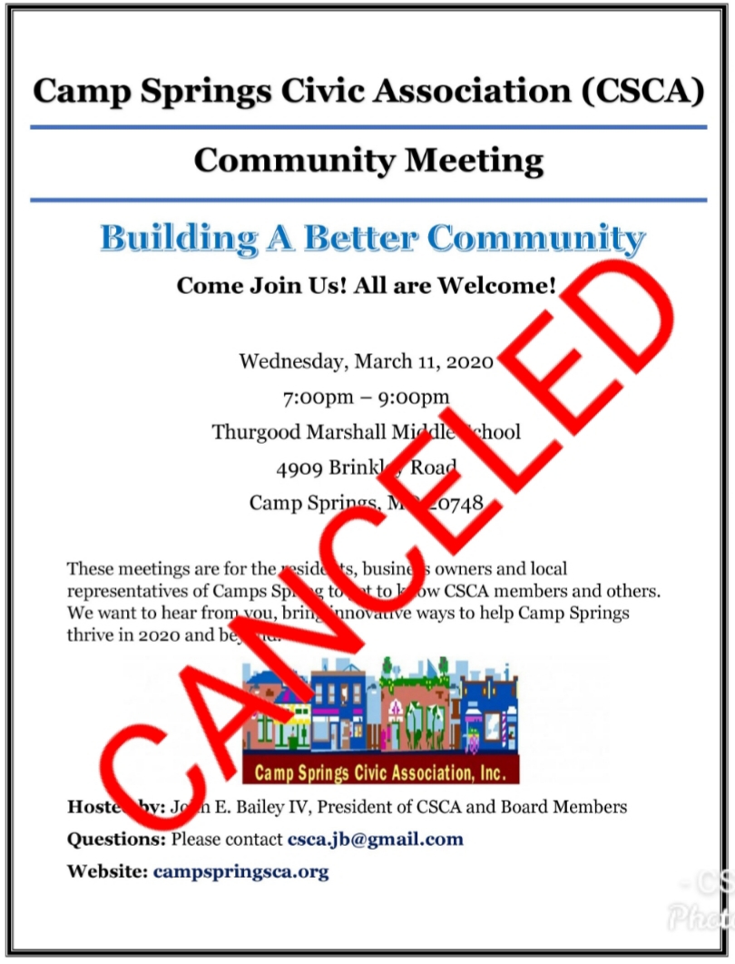 For the concern of our residents, we have decided to CANCEL the community meeting scheduled for tomorrow, March 11, 2020. Following the lead of our County Executive, Prince George’s County Health Dept. and the CDC we have chosen not to place our residents and most vulnerable seniors in jeopardy. Please, visit our website www.campspringsca.org where we will post updated information from our local government as well as the CDC. We ask that everyone be diligent in following the directions given to avoid spreading the (Covid-19) Corona Virus and be safe.