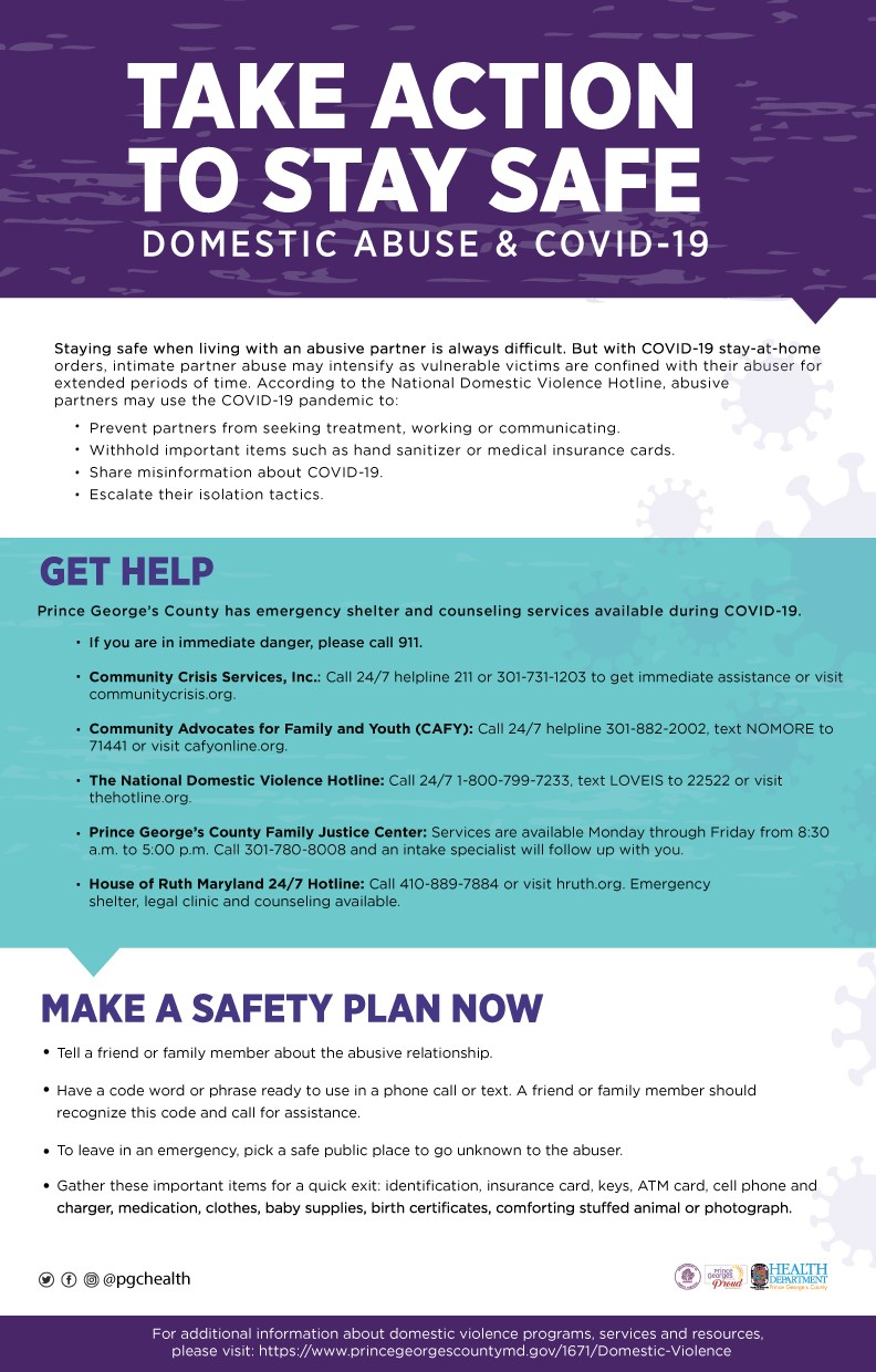 The Corona Virus has certainly changed life as we know it. We are living a new normal and adjusting to a new norm. Unfortunately, Stay-At-Home orders have made a difficult situation worse when it comes to those living in close quarters with their abuser. If you or someone you know is experiencing domestic abuse by an intimate partner there are resources still available. Prince George’s County Government has created an infographic full of resources and tips for our residents. Keep this information and share it with your friends and family. For more information and other infographics related to County changes, policies and resources during the COVID-19 response, please visit: https://www.princegeorgescountymd.gov/3397/Coronavirus.