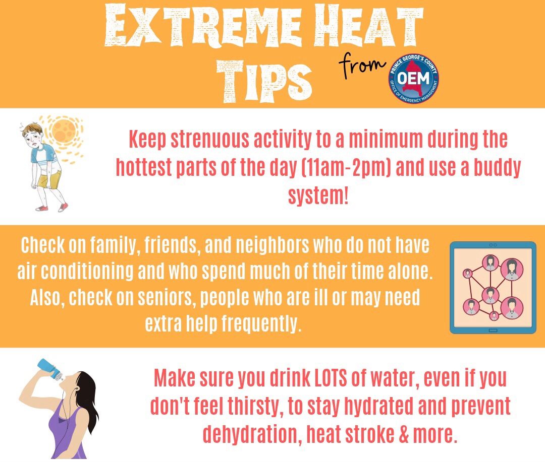 1) Cooling Centers: The Office of Emergency Management has worked with M-NCPPC to open three cooling centers in the County due to the extreme heat. At this time, they plan to have them open through Thursday, from 12 noon to 6 PM each day. Attached is a graphic for tips for extreme heat and how to avoid heat-related illnesses.