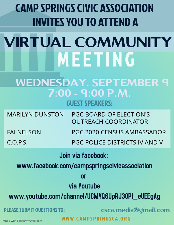 We invite you to join us for a community meeting being held on September 9, 2020 at 7:00 pm. Please submit any questions you may have for any of the speakers to csca.media@gmail.com. You can join the live broadcast through either link below: