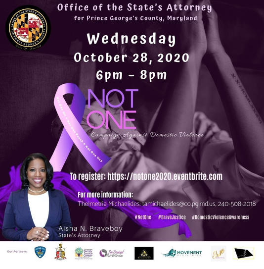 Join State’s Attorney Aisha Braveboy, Chief Anthony Ayers and other partners for the “Not One Campaign Against Domestic Violence” on Wednesday, October 28th from 6 pm- 8 pm.