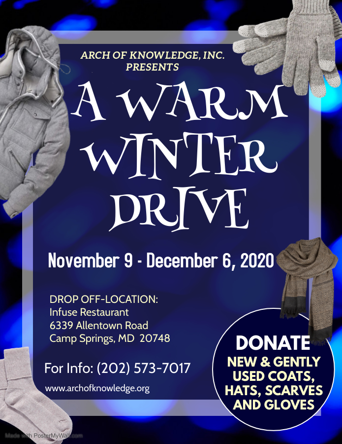 1. Arch of Knowledge, Inc (AOK) is hosting a winter warmth drive. November 9th – December 6th stop by Infuse Restaurant, 6339 Allentown Road, Camp Springs, MD to drop off new or gently used coats, hats, scarves, and gloves.