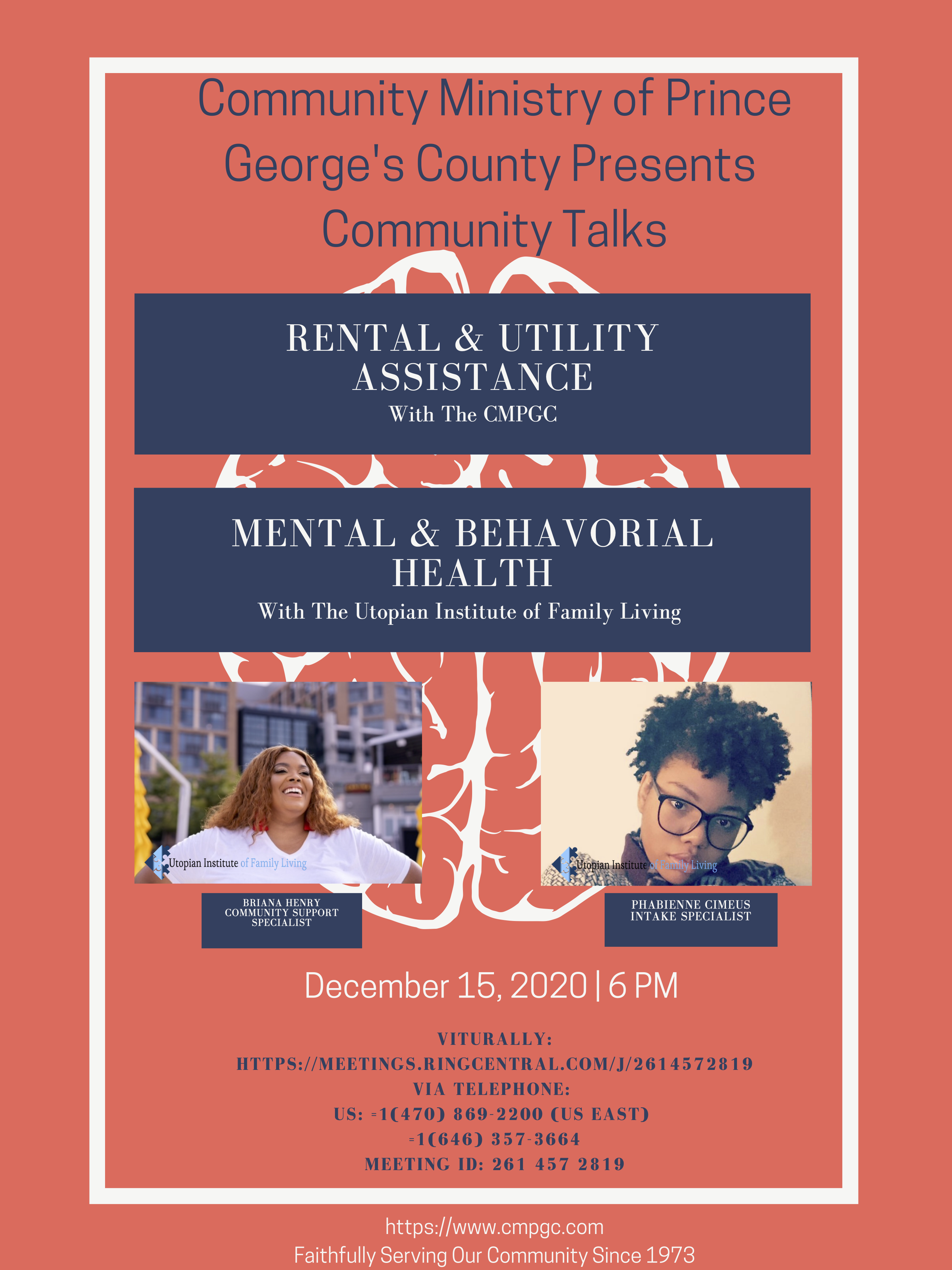 The Community Ministry of Prince George’s County Presents Community Talks. Topics discussed includes (1)Rental & Utility Assistance and (2) Mental & Behavioral Health.