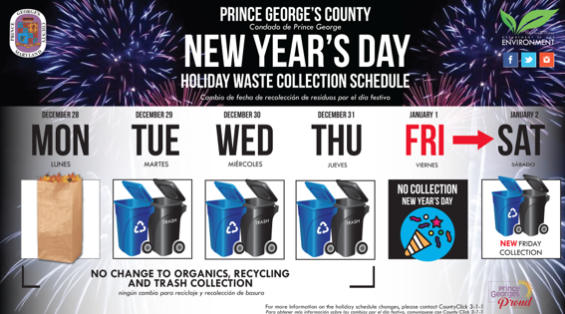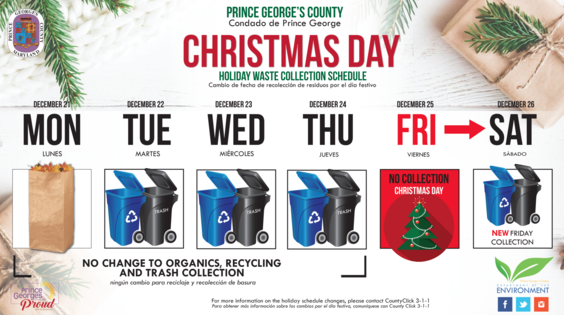 There will be no collection changes for yard trim on Mondays, and those receiving County trash and recycling collections on Tuesdays, Wednesdays and Thursdays. Due to the holiday, residents receiving trash and recycling collection on Friday will move to Saturday for both weeks. For more information on waste collection services, visit environment.mypgc.us.