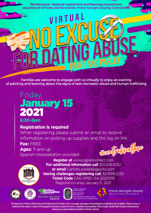 Please join the Maryland-National Capital Park and Planning Commission, Prince George’s County Department of Family Services and the Prince George’s County Human Trafficking Taskforce on Friday, January 15, 2021 for its No Excuse for Dating Abuse Virtual Paint and Parley. As we continue to navigate during these unprecedented times, we must ensure the safety of our youth.