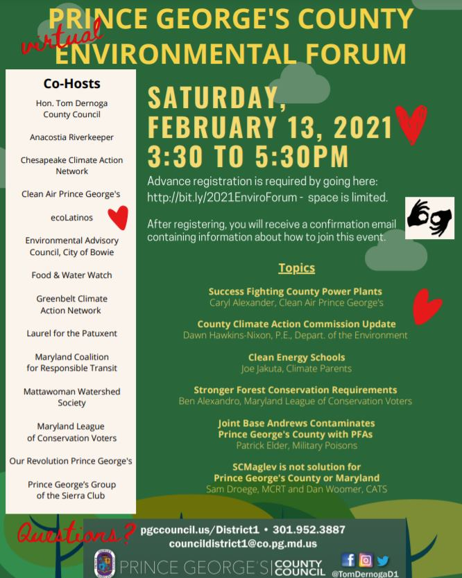 County Councilmember Tom Dernoga together with a number of organizations that focus on the environment and equity, invite you to an Environmental Forum on Saturday, February 13th form 3:30-5:30pm.