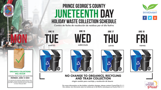 Prince George’s County will observe Juneteenth, an annual holiday commemorating the end of slavery, on Friday, June 18. Bulky trash collections will be suspended on that day and will resume on Monday, June 21. All yard trim and organic collections remain on schedule for collection on Monday, June 14. Trash and recycling collections will be on schedule for collection Tuesday, June 15 through Friday, June 18, and have no changes.