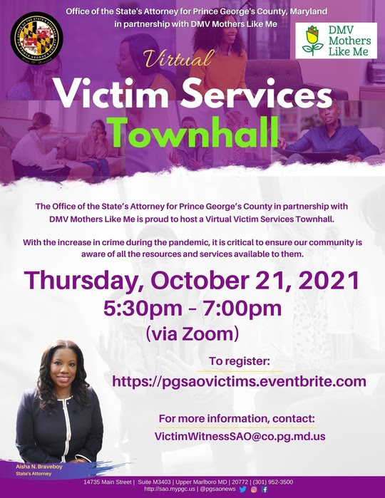 Please join the Office of the State’s Attorney for Prince George’s County, in partnership with DMV Mothers Like Me, for a Virtual Victim Services Townhall on Thursday, October 21, 2021 at 5:30 p.m. With the rise in crime our office has seen since the start of the pandemic, it is critical to ensure the community is aware of all the resources and services available.