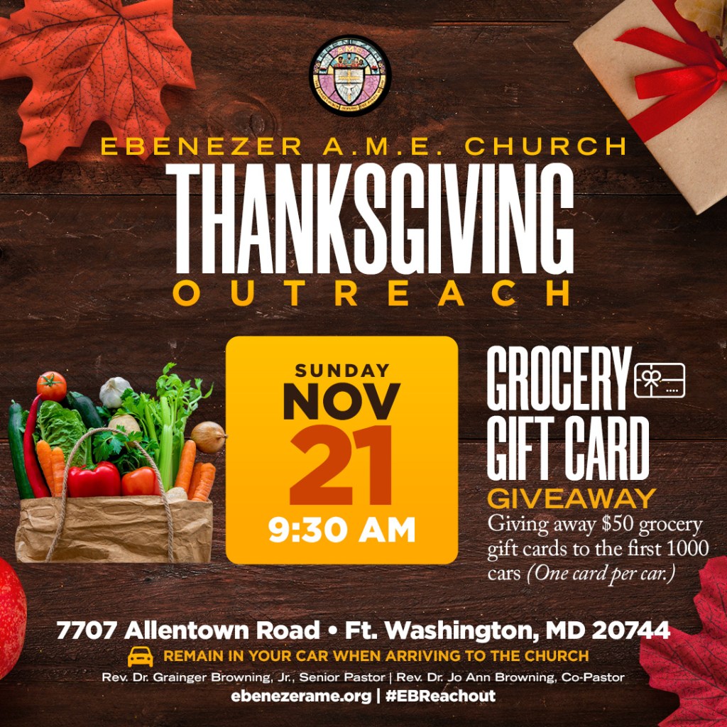 Ebenezer will distribute 1000 $50 grocery gift cards this Sun. Nov 21 at 9:30 a.m. on the church grounds. The grocery gift cards will help families provide food for their Thanksgiving meals. Please remain in your cars when arriving, one card per car please.