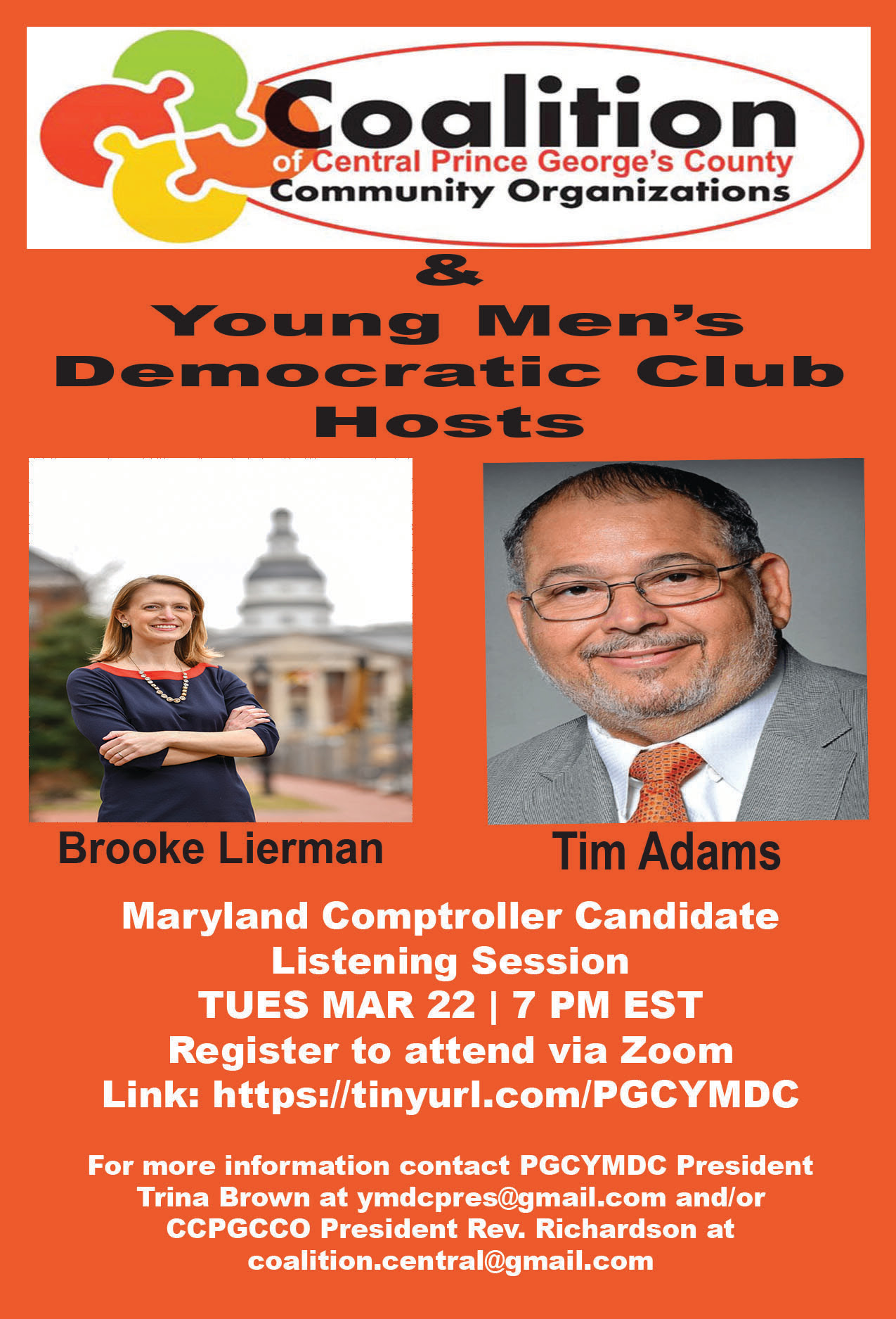 The Coalition of Central Prince George’s County Community Organizations (CCPGCCO) and the Young Men’s Democratic Club of Prince George’s County (YMDC) are hosting the Maryland Comptroller Candidate Listening Session with Brooke Lierman and Tim Adams. We will have PGCPS CEO Dr. Monica Goldson as our special guest who will address us before the candidate’s listening session starts.