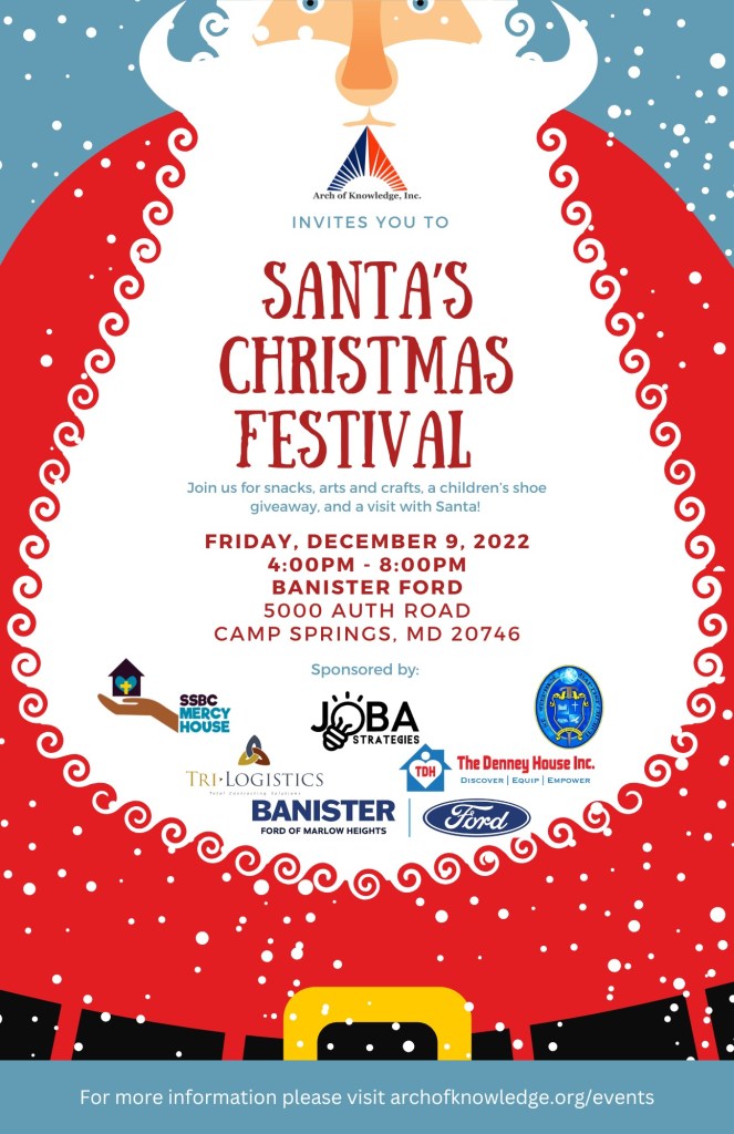 Arch of Knowledge, Inc. is a 501c3 non-profit charitable organization based in Prince George’s County. We are proud to continue to partner with our elementary schools in our area to bring a smile to the young people in our community. We have collaborated with local businesses and faith-based organizations to create an event specifically for our elementary aged students. We would appreciate it if you can share this information with your students and parents. The event will be December 9, 2022, starting at 4:00 pm and located at Banister Ford 5000 Auth Rd. Camp Springs, Md. 20746. During the event we will be providing toys, new shoes, arts and crafts, and pictures with Santa. The event supplies will be on a first come first serve basis and registration is recommended but not required.
