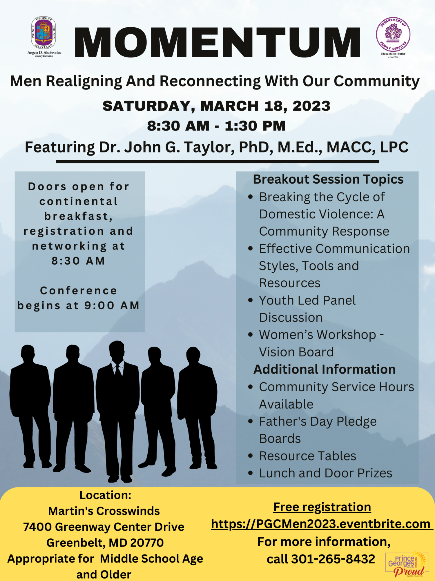 The Department of Family Services, Domestic Violence and Human Trafficking Division is excited to announce its continuation of the MoMENtum Series Men and Boys Conference. This years’ conference is titled “MoMENtum: Men Realigning and Reconnecting with our Community”. The conference will elevate the dialogue to educate men and young males on healthy relationships. The conference will be held on Saturday, March 18, 2023, at Martin’s Crosswinds, Greenbelt, Maryland.