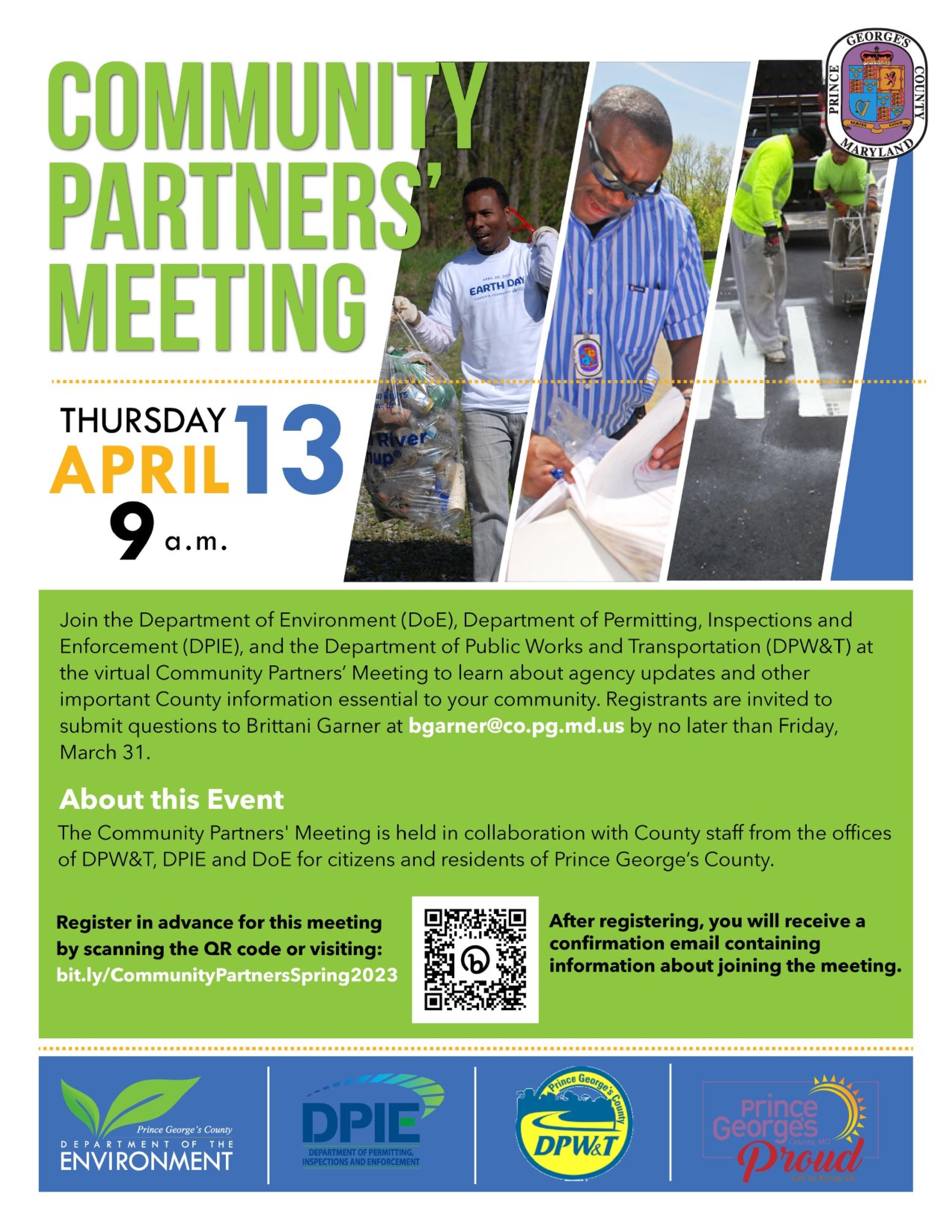 Join the Department of Environment (DoE), Department of Permitting, Inspections and Enforcement (DPIE), and the Department of Public Works and Transportation (DPW&T) Thursday, April 13, 2023, at 9:00 AM at the virtual Community Partners’ Meeting.