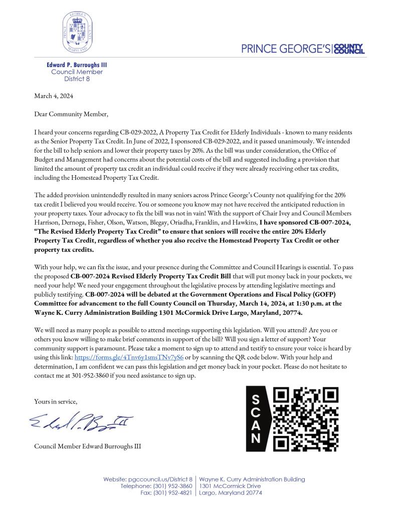 Council Member Burroughs needs your help. The County Council’s Government Operations and Fiscal Policy (GOFP) Committee will debate the revised Senior Tax Credit Bill Fix next Thursday, March 14, at 1:30 p.m. at the Wayne K. Curry Administration Building (1301 McCormick Drive Largo, Maryland 20774). He calls on the community to support the bill fix by filling the seats and commenting publicly on the floor. We ask for your help in reaching as many community members as possible. Please share the following letter with your network! The letter goes into further detail about the ask and should answer any questions people may have. This is your opportunity for you to help yourself.