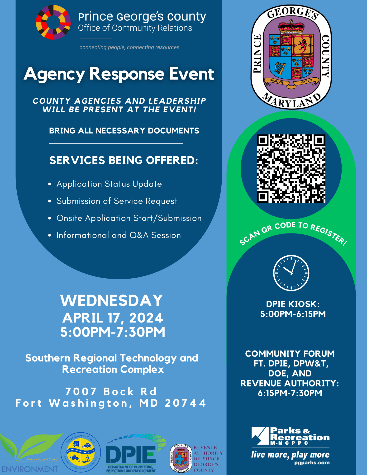 You are cordially invited to attend our upcoming Agency Response Tour event featuring DPIE, DPW&T, DOE, and the Revenue Authority. The event is scheduled for April 17, 2024, from 5:00 pm to 7:30 pm at the Southern Regional Technology and Recreational Complex, at 7007 Bock Rd, Fort Washington, MD 20744.