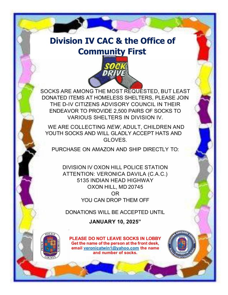 Division IV Citizen Advisory Council and the Office of Community are collecting new socks. These socks are for adults, children, and youth in various homeless shelters in Division IV. Hats and gloves are also welcome.