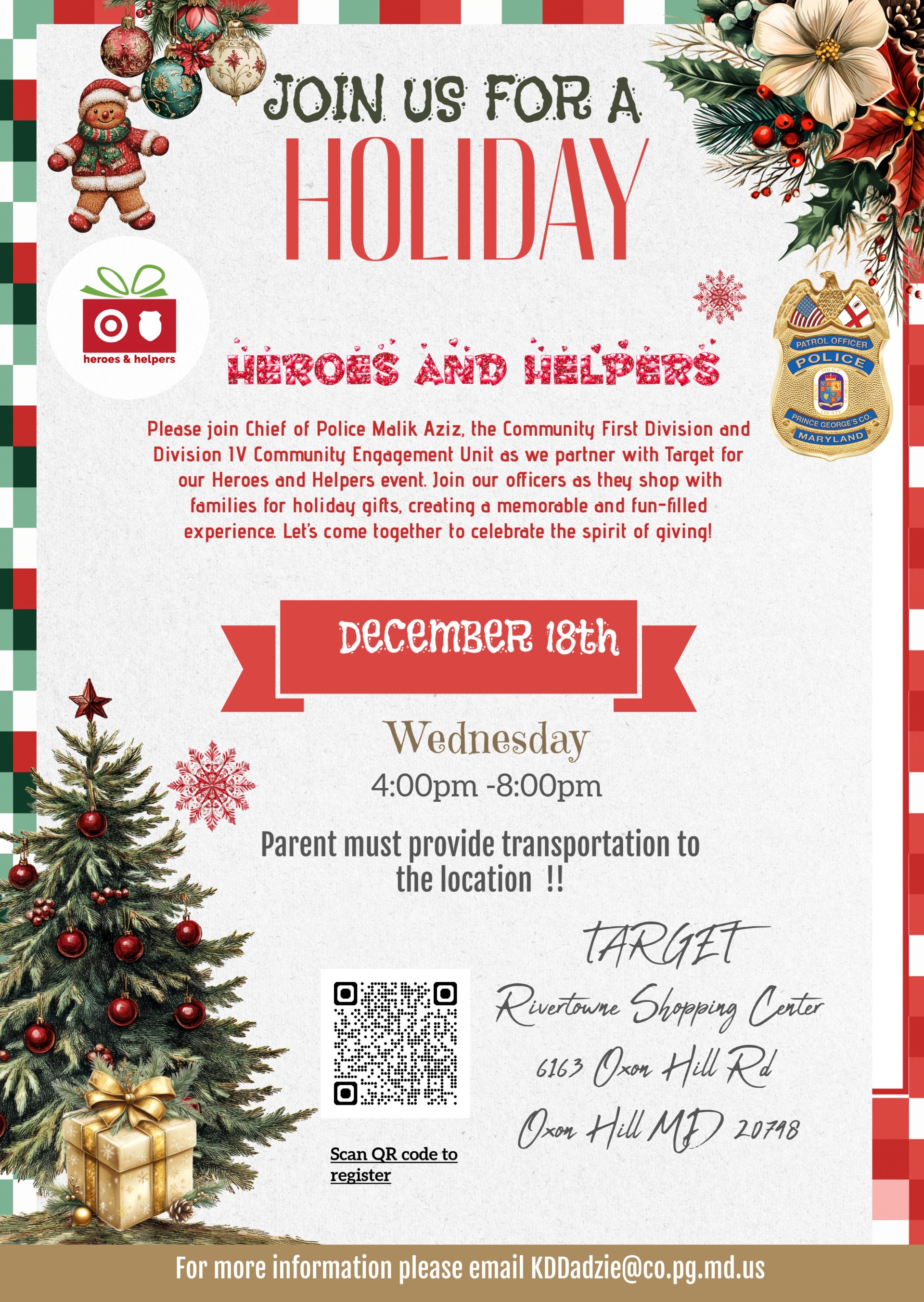 Exciting News! The Prince George’s County Police Department is partnering with Target for Heroes and Helpers! ?? This wonderful event will bring joy to 110 families, each receiving a $250 gift card to shop alongside our officers. We can’t wait to spread some holiday cheer together. To register please click on the link below or scan QR code on flyer.