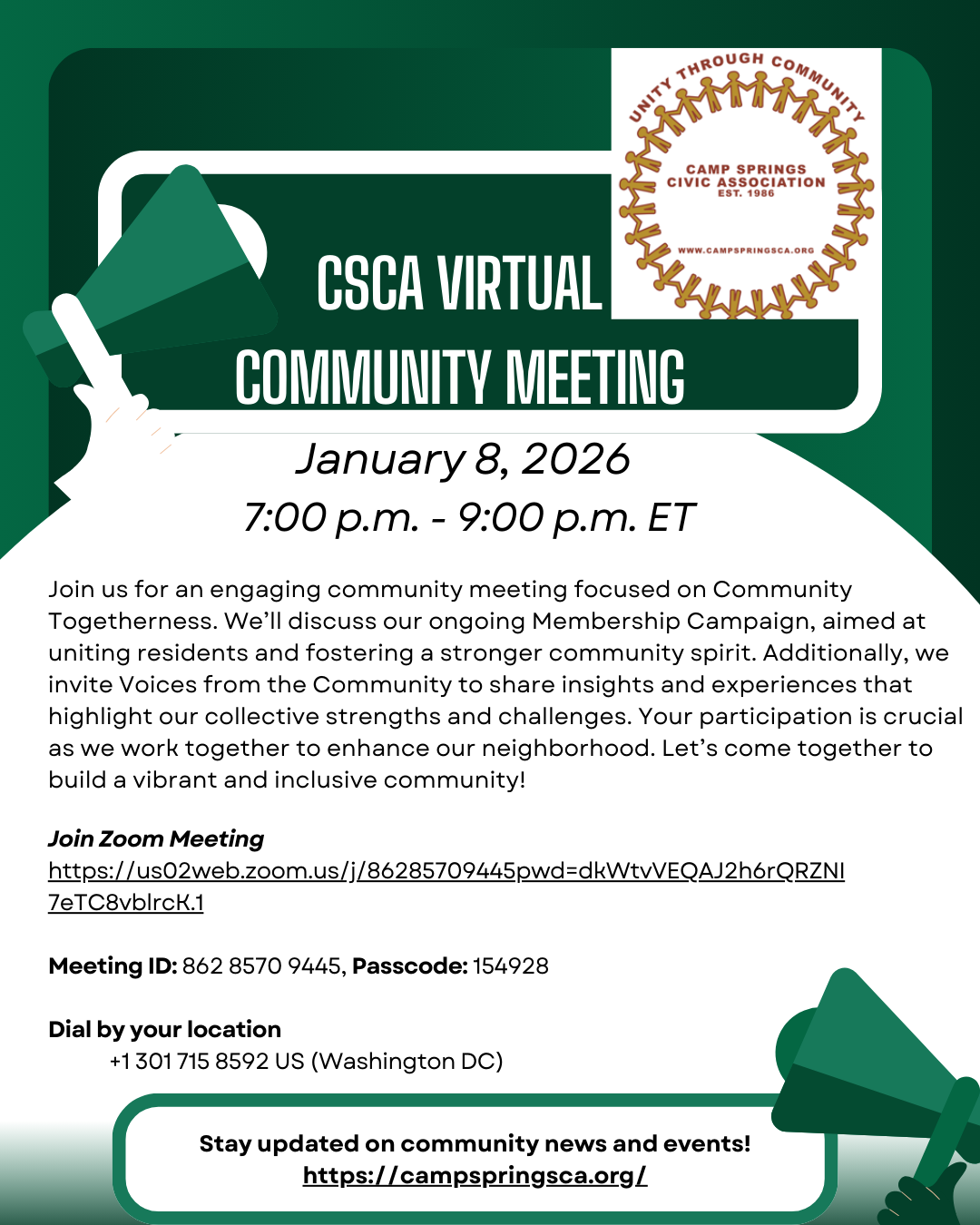 Join the Camp Springs Civic Association for an engaging community meeting focused on fostering community togetherness. We also encourage you to participate in a brief survey about the association to help us better serve our community. Your voice matters—let’s build a brighter future together! Please see the details below: