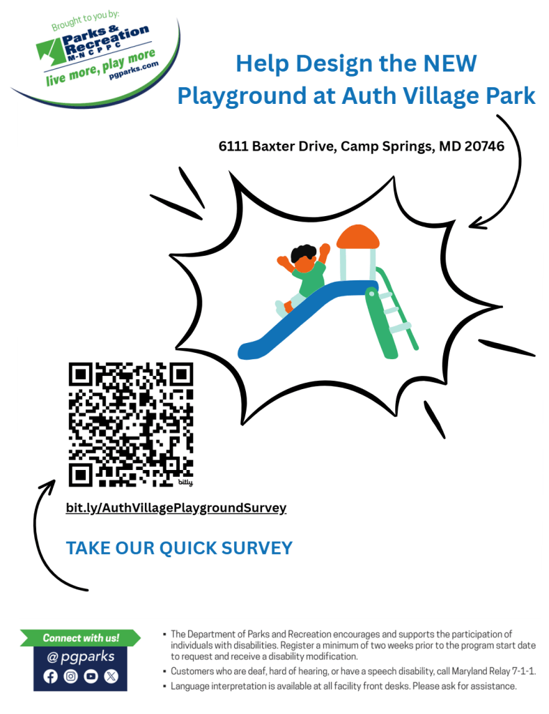 Residents in the community surrounding Auth Village Park (6111 Baxter Drive, Camp Springs, MD 20746) are invited to participate in shaping the design of a new playground at the park. For more information, please visit the link below. The survey will close on January 23rd.
