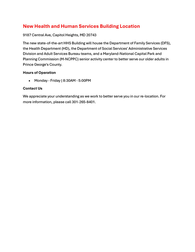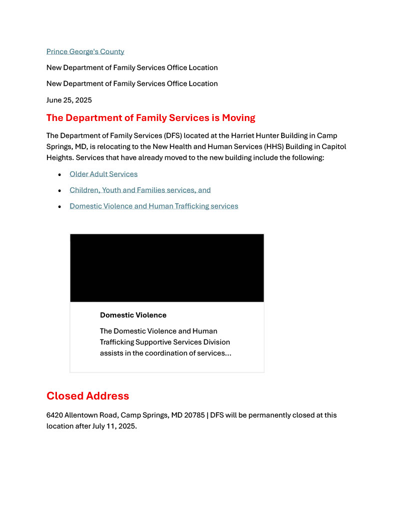 The Department of Family Services Office in Camp Springs, MD is Moving