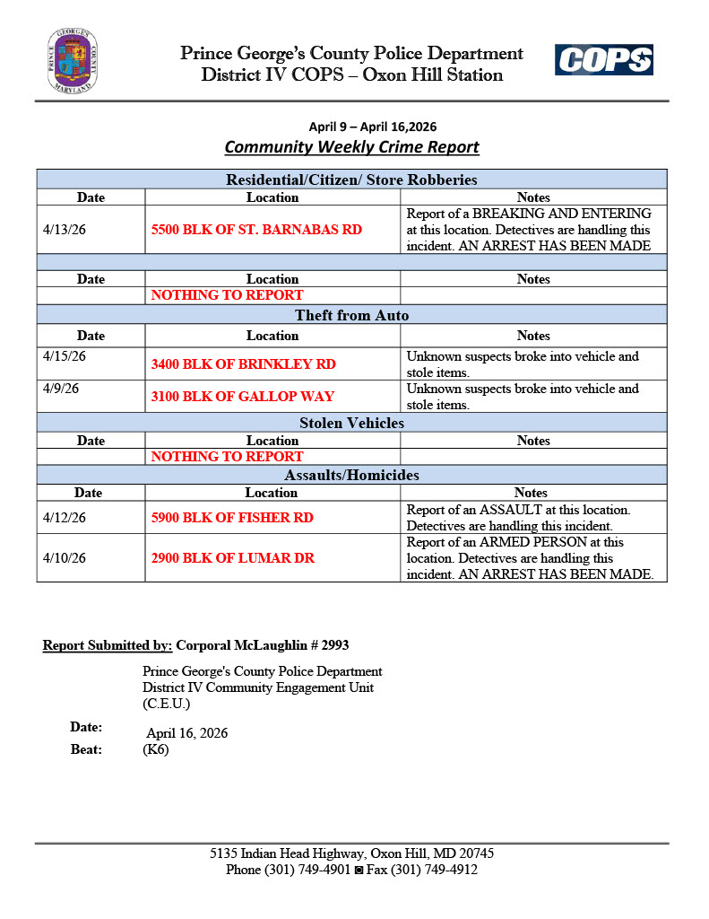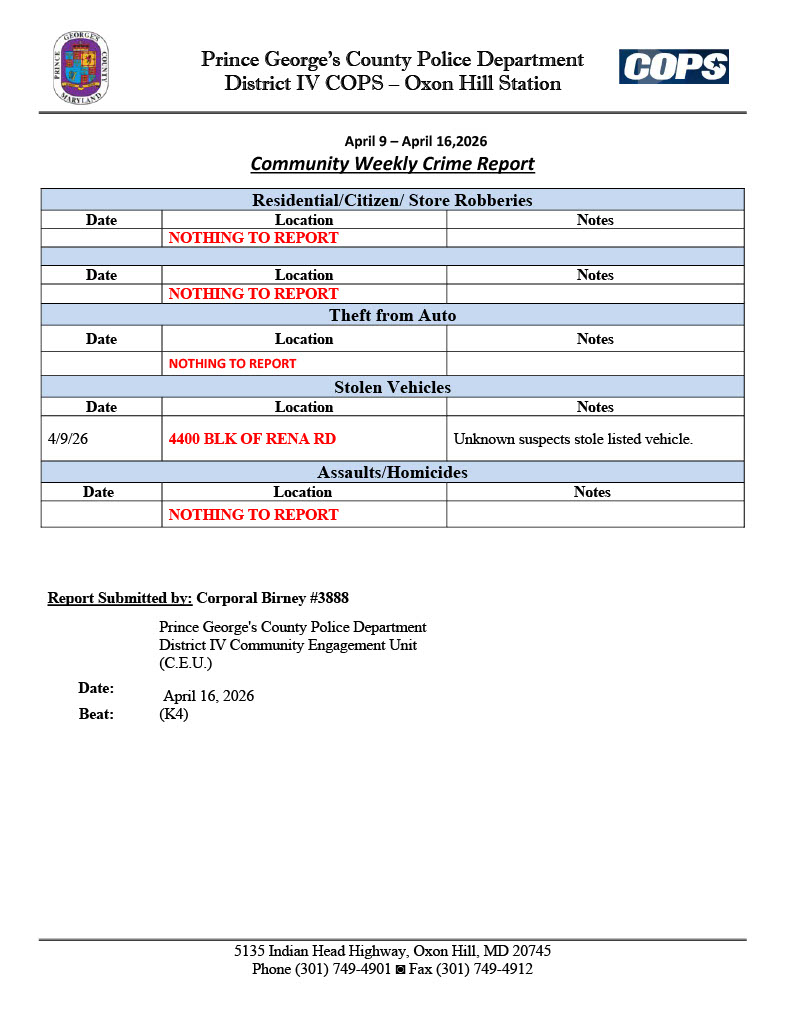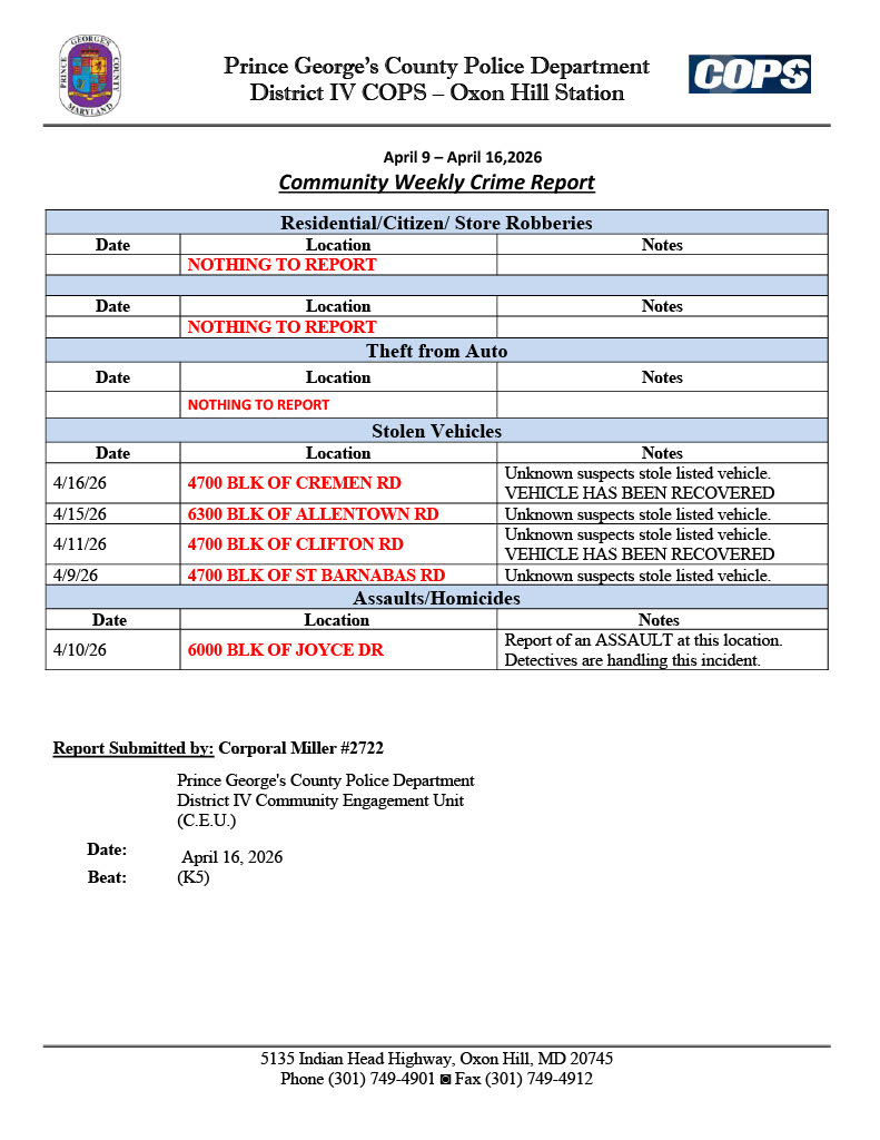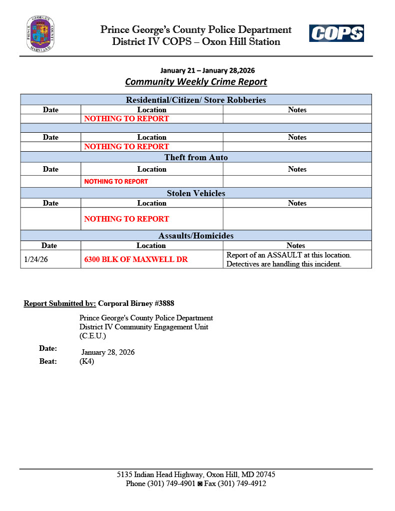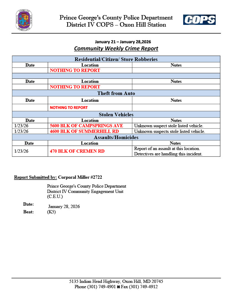 The Prince George’s County Police Department, District IV COPS, shares weekly reports on criminal activities in the area. These reports keep the community and organizations informed, enhancing overall safety.
